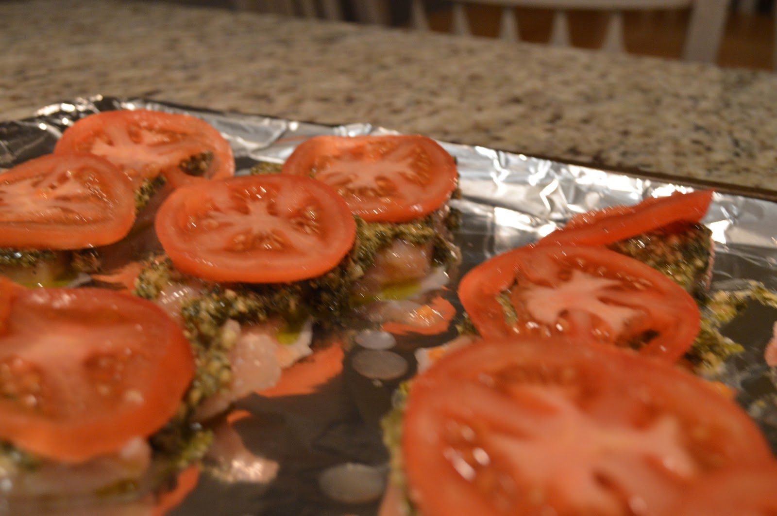 Preheat oven to 400 degrees. Place the chicken breasts between two sheets of wax paper and pound until about 1/2 inch thickness. Slice each chicken breast in half. Salt and pepper each chicken breast. Dollop about 1 tablespoon of pesto over each chicken breast, spreading over it evenly. Layer two tomato slices on top.