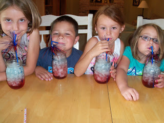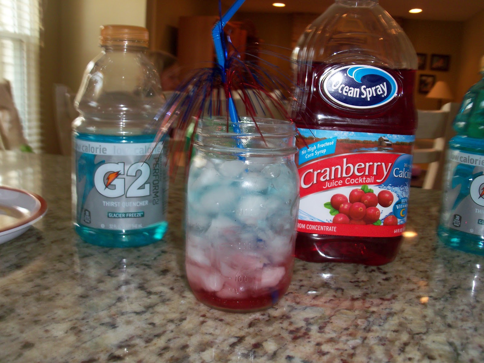 Red, White and Blue Beverages: I used Cranberry Juice Cocktail (high in sugar) for the red, Sierra Mist for the white and low calorie blue gatorade for the blue