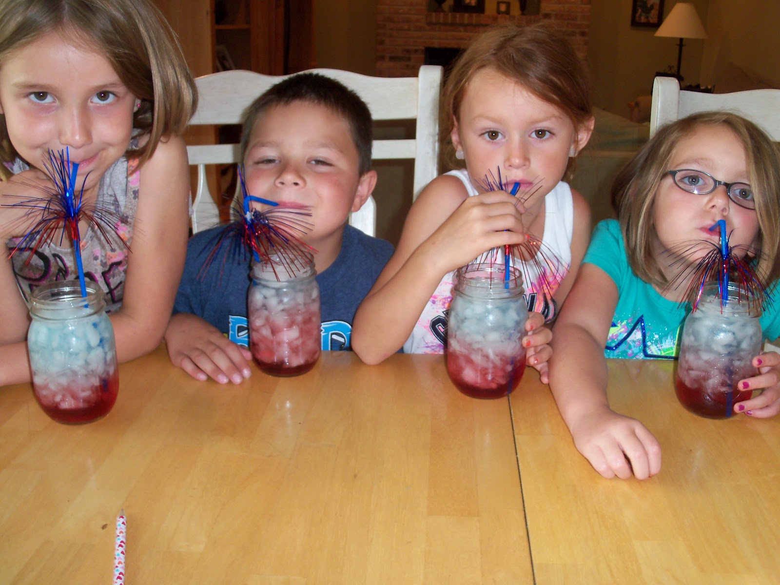 So these are so fun and perfect to “wow” the kids! I made these today for my two girls and their friends and they loved them! Not only were they cool to look at, they tasted really good too. I have never done anything like this before and was definitely skeptical, but it really worked! These layered drinks are so easy to make, but will be the talk of your 4th of July party! Just remember to layer according to sugar content: the drink with the most sugar goes on the bottom, and upwards from there, with the drink with the least sugar on top. Also, don’t forget to fill the ENTIRE glass with crushed ice. Add a sparkly straw and you have a drink your kids will remember! Enjoy and Happy 4th of July! 🙂