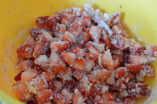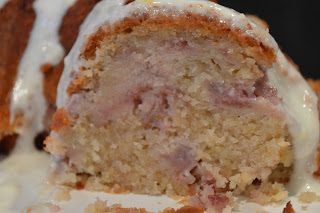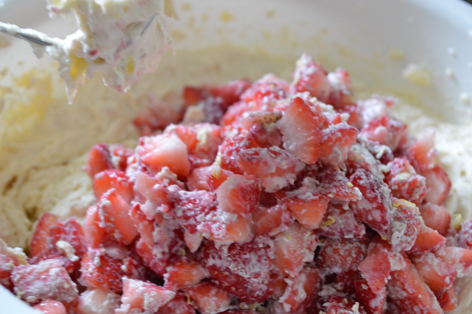Preheat the oven to 375 degrees and grease and flour a bundt pan. Flour well…this cake will stick if pan is not prepared correctly! In a large bowl, cream together butter and sugar. Add eggs one at a time and lemon juice and mix well. In a medium bowl, mix 2 1/4 cups flour, baking soda and lemon zest. Add dry ingredients to butter mixture slowly and mix well. Add yogurt and combine. Toss strawberries with remaining 1/4 cup flour and fold into batter.