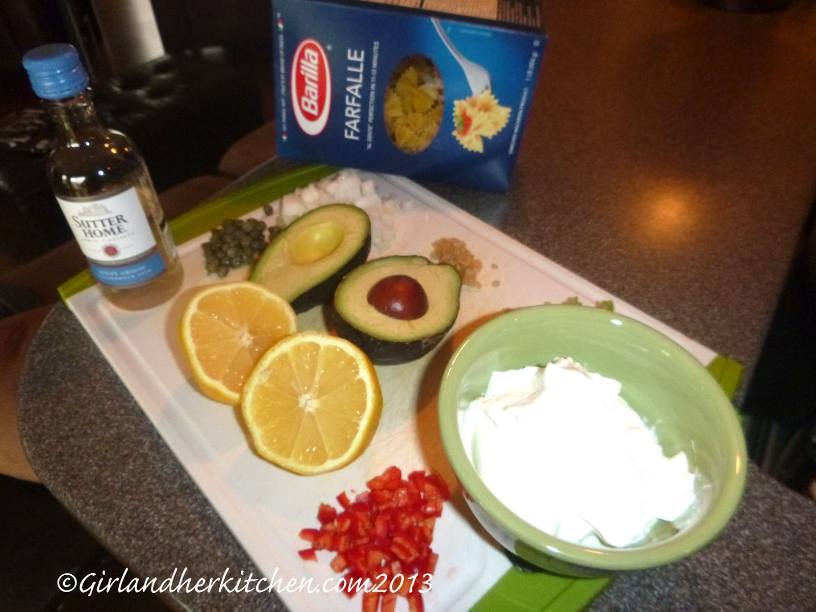 Peel and dice the avocado and squeeze lemon over the diced pieces to keep them fresh and green. Whisk the sour cream (or plain yogurt) with the remaining 2 Tbs. of oil, salt, pepper, jicama, capers, and remaining chili pepper.