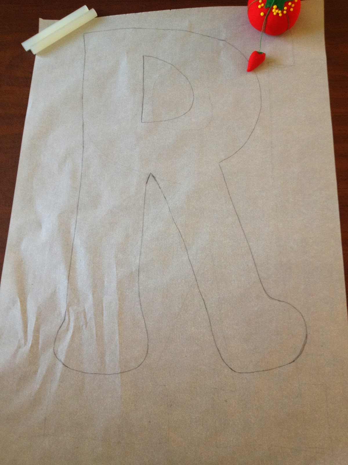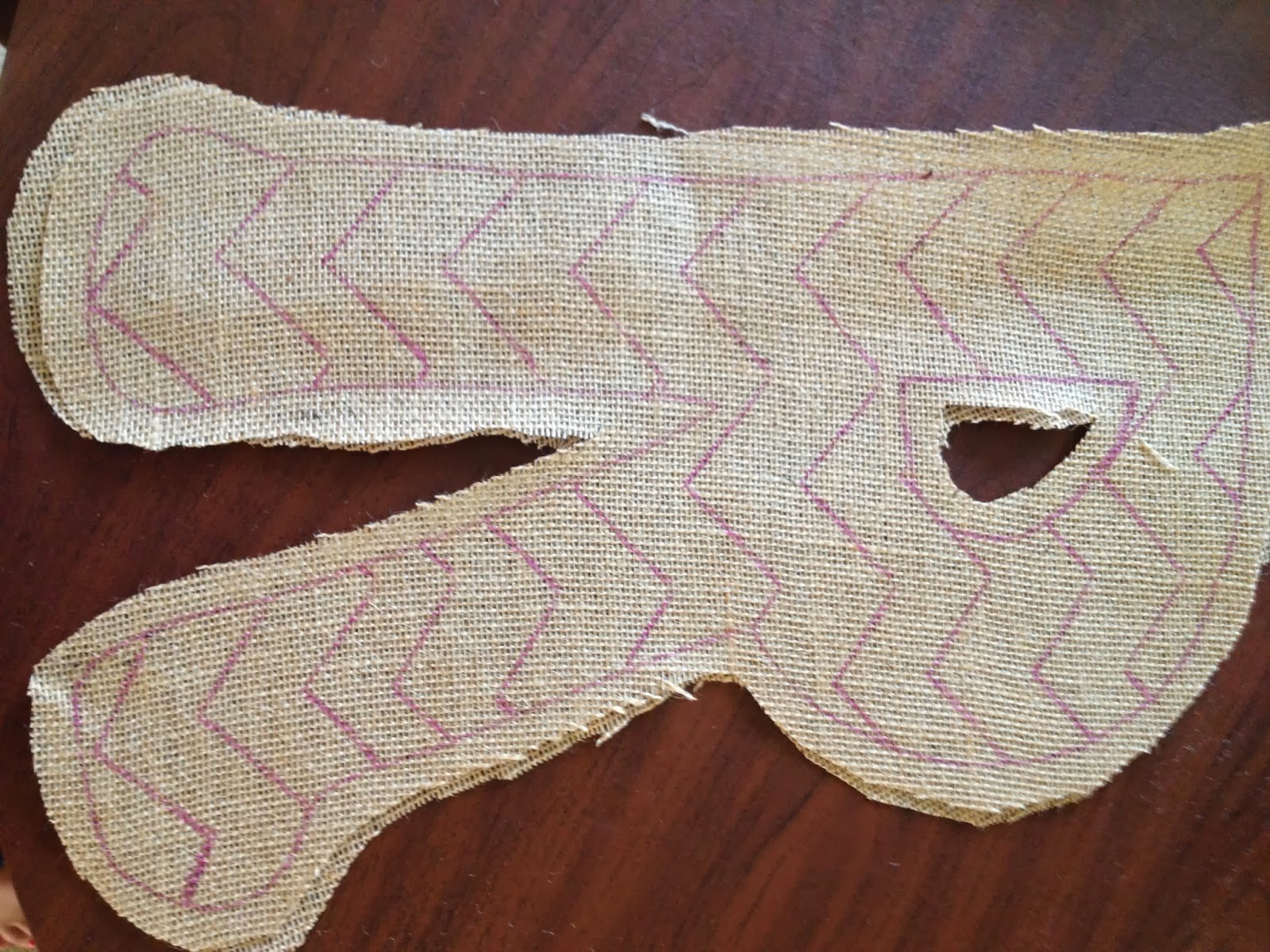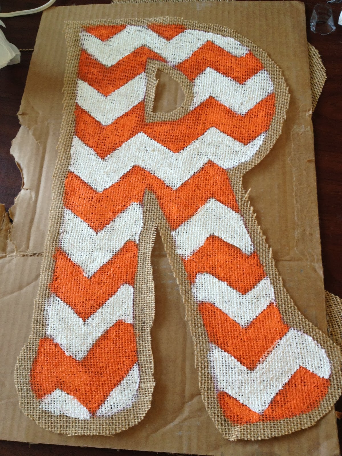 Next cut two letters out of the burlap, one for the back and one for the front.  Then grab a template for your design.  I used chevron and just drew the template myself. If you need help there are tons and tons of free templates online you can print and use. It helps if your template it is on some sort of card stock or poster paper.