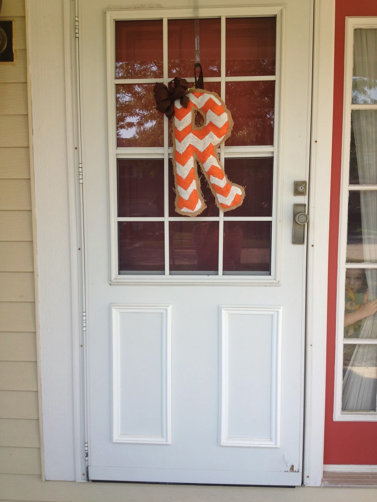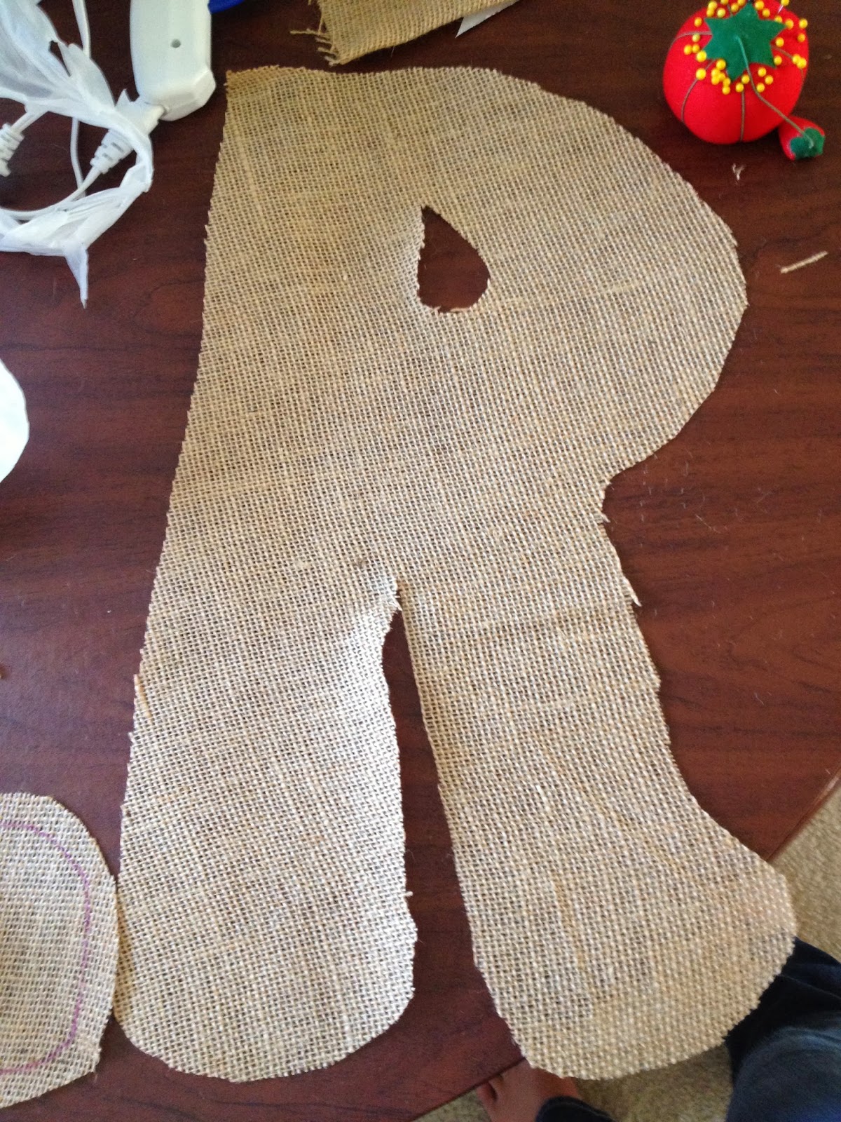 When the paint is dry you will need a glue gun and some stuffing of some sort.  I used an old pillow I had.  You can use plastic bags, or batting from your local craft store.  I began to glue at the top, leaving the extra burlap on the outside of my letter unglued. Then I just continued to stuff and glue until I was finished.  You Do Not want to wait until the end to stuff, it will be near impossible.  So just do a little at a time. When you are finished add some sort of a hook or loop to the back and if you want, a little fun bow to the front to give it an extra pop!! (idea from live a little wilder.) 🙂