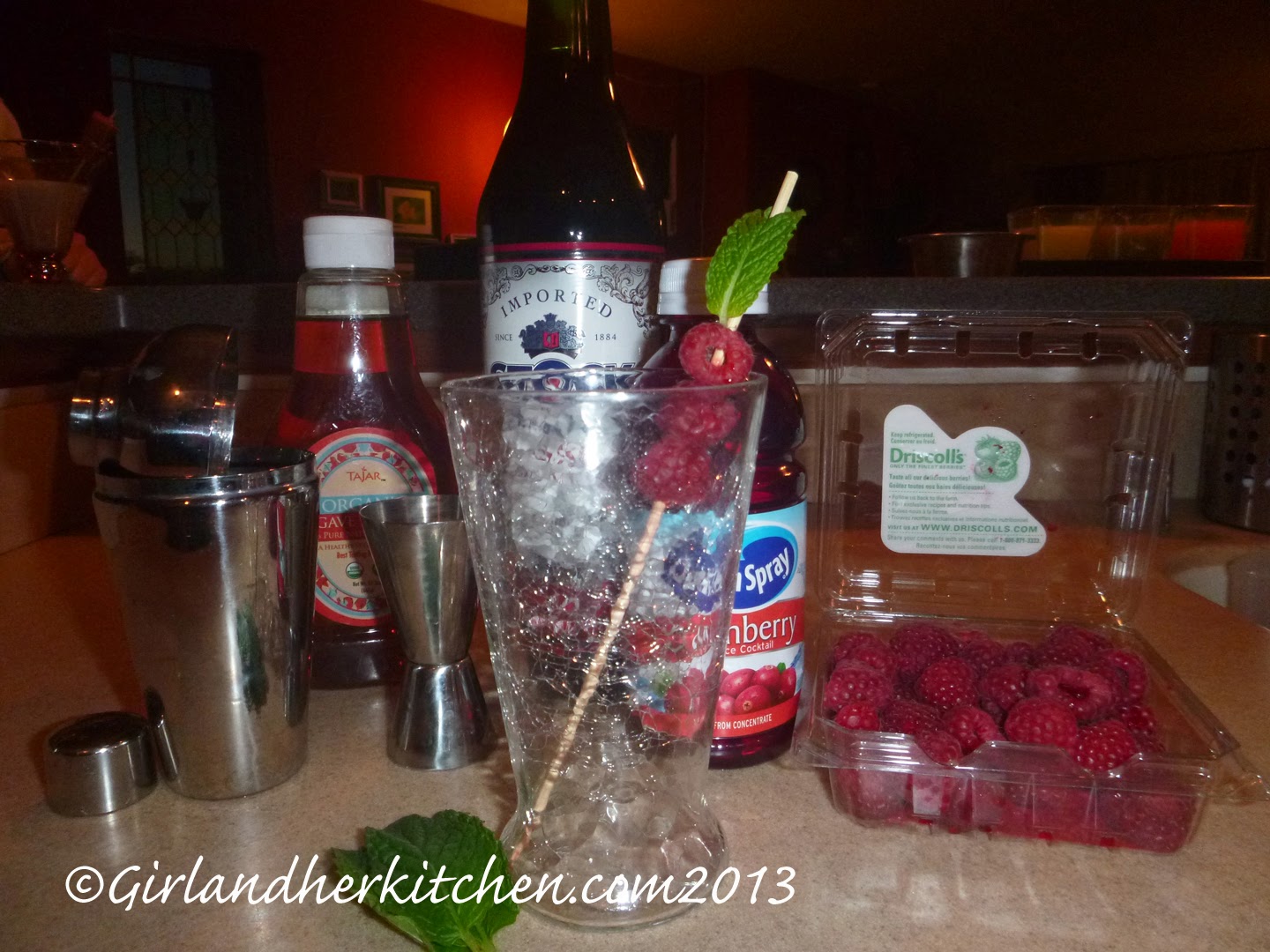 Muddle (crush) two raspberries, 2 mint leaves and agave in a cocktail shaker. Add in 1/2 cup of ice, vermouth, and cranberry juice. Shake until chilled through. Pour through strainer into chilled cocktail glass. Serve with a couple of raspberries and a sprig of mint on a skewer to make it look more festive.